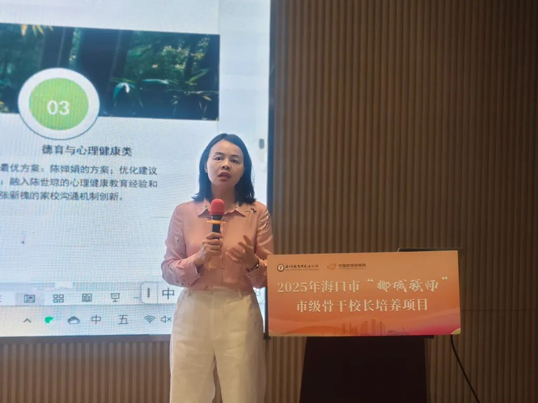 6月21日下午,八位校长展示行动研究成果:海口市椰海学校副校长于彦飞聚焦教研优化,从资源体系与流程机制入手破除形式主义;海口市琼山区东昌学校校长陈川依托乡村特色开发胡椒种植校本课程,提升学生核心素养;海口琼崖纵队红军小学校长韦清借鉴优质经验,以项目化学习赋能红色基因传承;海口市五源河学校副校长王妍妍针对年轻班主任培养构建培训与评价体系;海口市海景学校副校长高元聪探索智慧课堂模式,推动数字化教学转型;海南华侨中学副校长吴憾宇聚焦基于学科素养的教研活动标准化流程设计,计划通过调研分析、优化流程、激发教师自觉及系统谋划,探索教研成果向教学实践转化的有效路径;海口市灵山中学校长张岩以扁平化管理激发教师积极性;海口市滨江英才小学校长阙平则通过集团化办学实践促进教育均衡。
