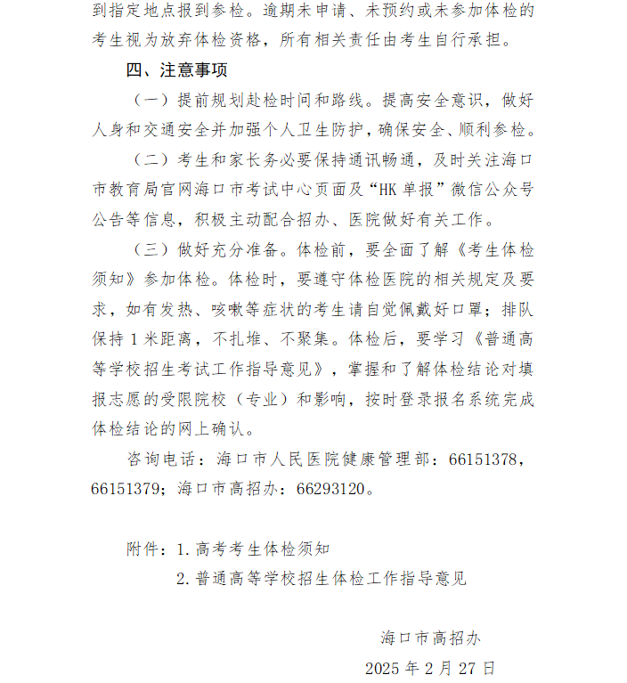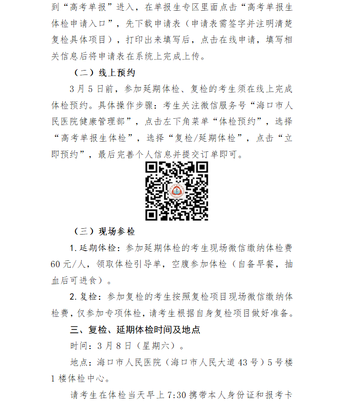 2025年海口市高考单报生复检、延期体检通知