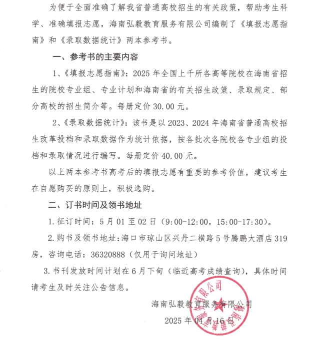 关于2025年海口市单报生订购领取《填报志愿指南》和《录取数据统计》的说明