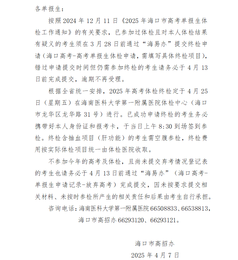 2025年海口市高考单报生终检通知