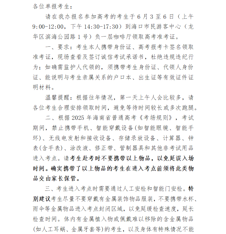 关于单报生领取准考证及不得携带手机等违禁物品进入考点的通知