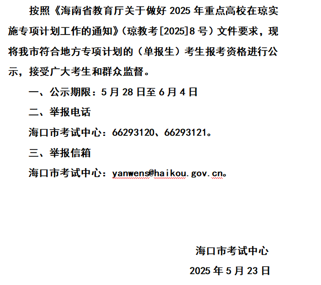 | 2025年海南省普通高考(单报生) 符合报考地方专项计划条件的考生名册 |