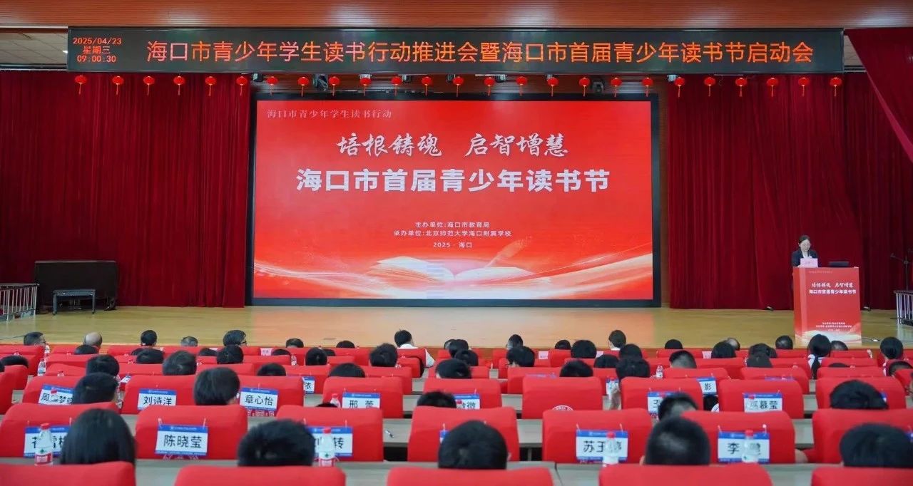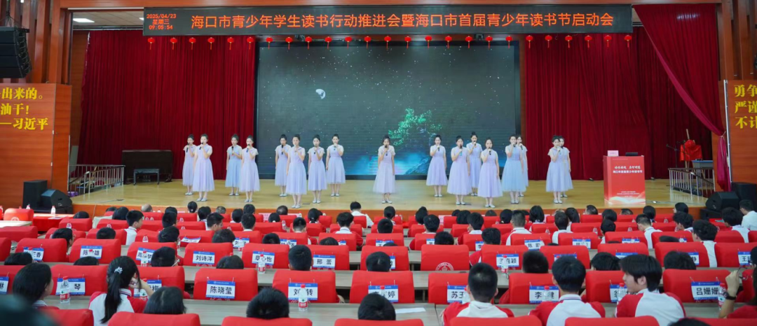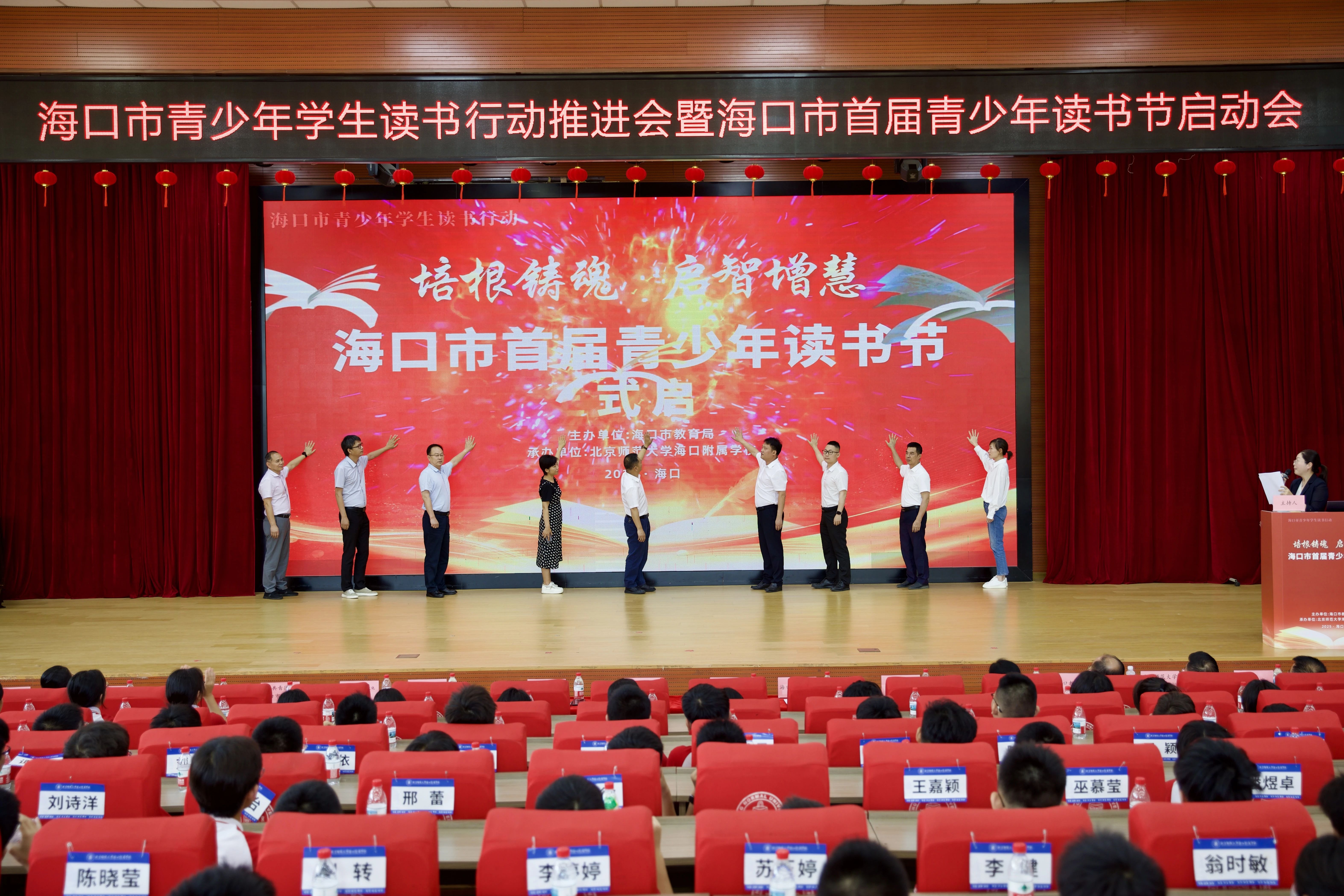 4月23日,海口市青少年学生读书行动推进会暨海口市首届青少年读书节启动会在北京师范大学海口附属学校隆重举行。市教育局党组成员、副局长陈成章、李雄伟,市委宣传部、市委网信办、市旅文局等部门领导,全市中小学代表及师生家长400余人齐聚一堂,共赴这场书香之约。