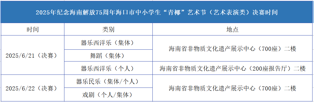 活动期间,“青椰”艺术节线下决赛及全市巡演计划在海南省非物质文化遗产保护中心、省歌舞剧院等专业场馆举行,依托专业场地设施为优秀作品提供高水准展演舞台,进一步丰富椰城青少年艺术体验,助力学生在艺术鉴赏中提升美育素养。