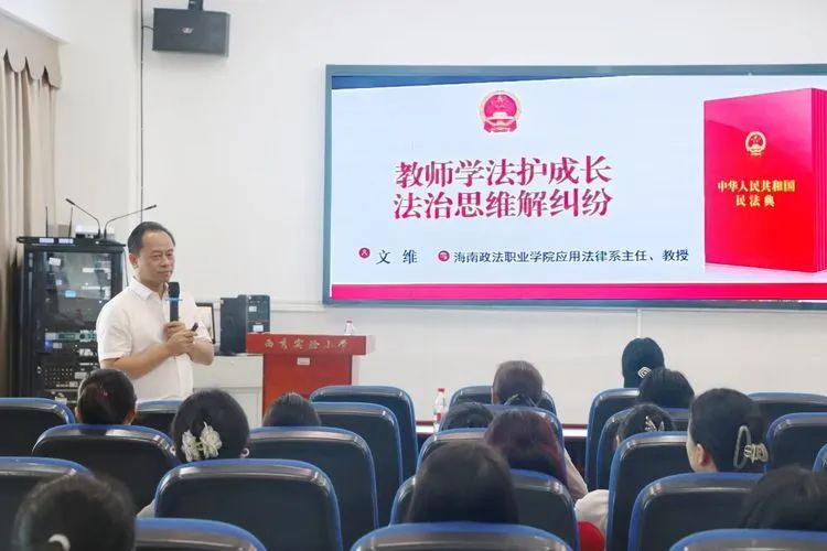 2025年6月12日,海口市港湾教育集团西秀实验小学携手海南省法学会、海南政法职业学院,举办“法治护苗驿站”揭牌仪式暨普法宣讲活动,以“教师学法护成长・法治思维解纠纷”为主题,探索校地合作新路径,为平安校园建设注入法治力量。
