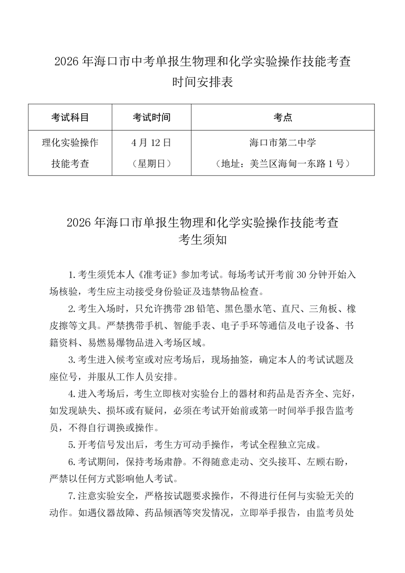 2026年海口市中考单报生体育科目考试及物理和化学实验操作技能考查考前温馨提示