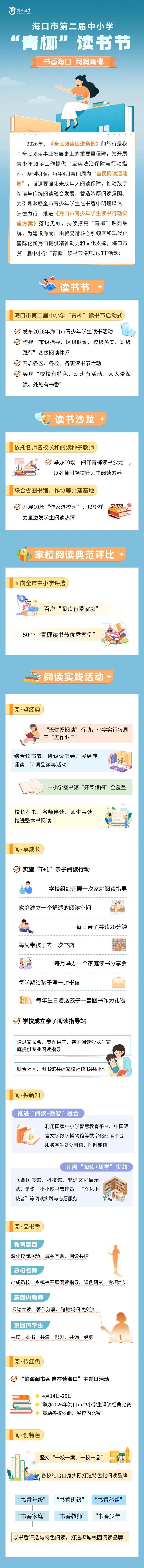为深入贯彻习近平总书记关于“爱读书、读好书、善读书”的重要指示精神,推动《全民阅读促进条例》全面实施,在首个“全民阅读活动周”(4月20日-26日)来临之际,海口市教育局积极响应全国青少年学生读书行动号召,将于4月23日正式启动海口市第二届中小学“青椰”读书节!